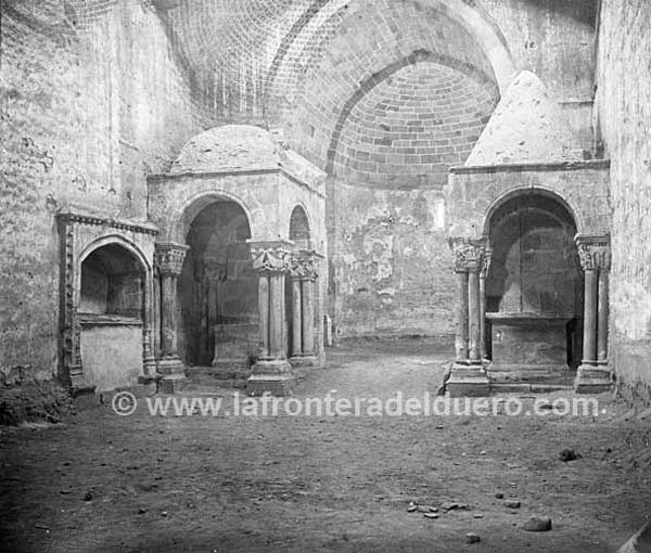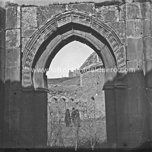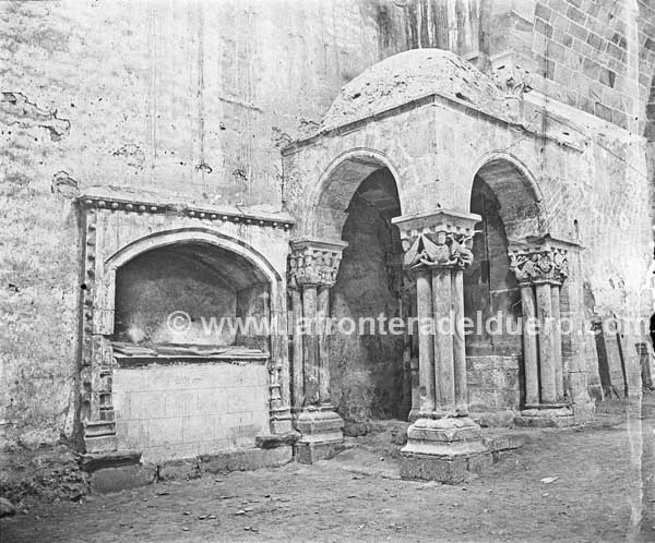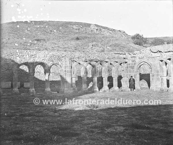 Esta fotografía fue tomada en fecha no determinada pero en todo caso entre 1906 y principios de 1908. Se observa al fondo de la imagen que en el extremo occidental de la galería norte no existen los arcos que más tarde se rehicieron con inclusión de algunos capiteles y dovelas originales. Su situación en este momento es la que correspondía a la descrita por don Teodoro Ramírez Rojas en su libro Arquitectura Románica en Soria publicado en 1894: «De las cuatro galerías falta la mitad de la que se extiende paralela al muro del templo, que, á juzgar por los capiteles historiados que presenta el ángulo Norte del claustro, del que han desaparecido las basas y columnas, y por el capitel, historiado también, del macizo colocado en el promedio de dicha galería Norte, debió hallarse decorada con capiteles del mismo género...» |