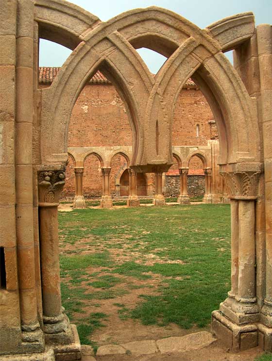 También aquí se aprecia la desproporción en la longitud de los lados del claustro, de forma que este ángulo lo forman seis arcos por el lado N y sólo cuatro por el E. Son todos ellos apuntados y no descansan sobre podio corrido sino sobre basas individuales mediante fustes cuádruples cruciformes. Cronológicamente, este tramo sería algo posterior al románico más puro del NO. |