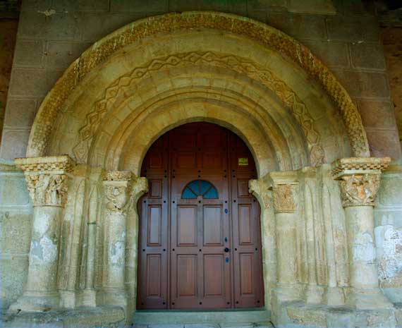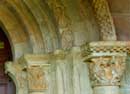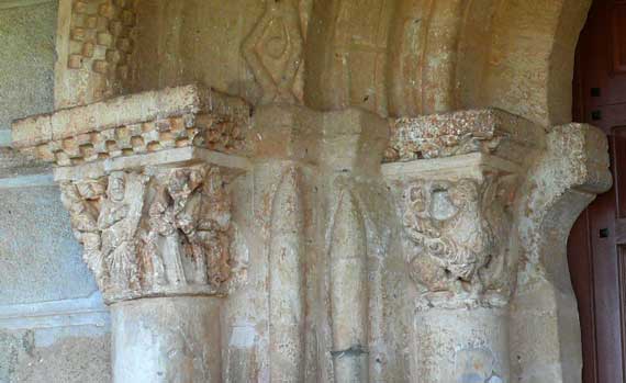 La arquivolta exterior es de ajedrezado jaqués y la siguiente de doble zigzag enfrentado formando rombos en algunos de los cuales se insertan bezantes u otras figuras ornamentales. Las demás arquivoltas son baquetonadas o lisas. En esta imagen se muestra el conjunto de los capiteles del lado izquierdo. |