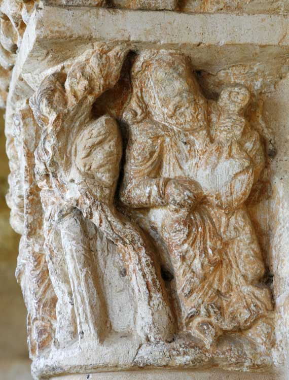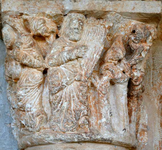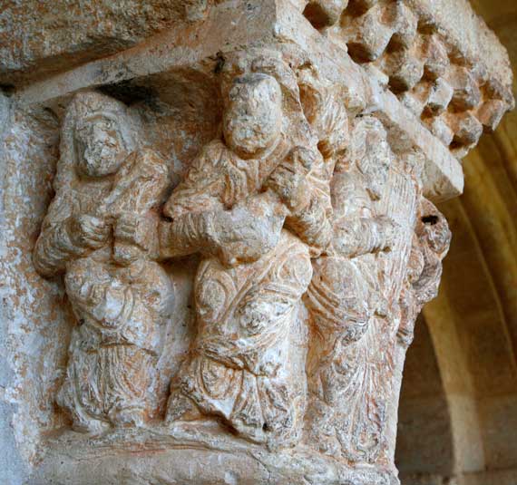 El capitel exterior del lado izquierdo recoge una serie de personajes que por su atuendo de largas túnicas parecen moriscos. Todos ellos tañen diversos instrumentos musicales de cuerda: uno, un arpa; otro, una especie de guitarra; dos de ellos, instrumentos de arco a modo de violines. Estas son la cara central del capitel y la lateral derecha. |
