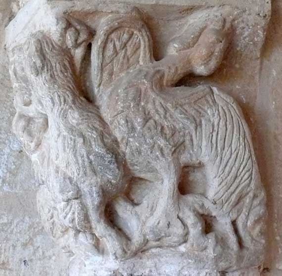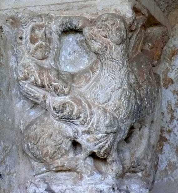El otro capitel de la jamba izquierda representa la tan repetida escena de Sansón en lucha con el león al que inmoviliza entre sus piernas mientras lo desquijara. En la otra cara aparece una arpía de plumaje tallado al modo silense. |