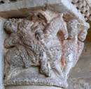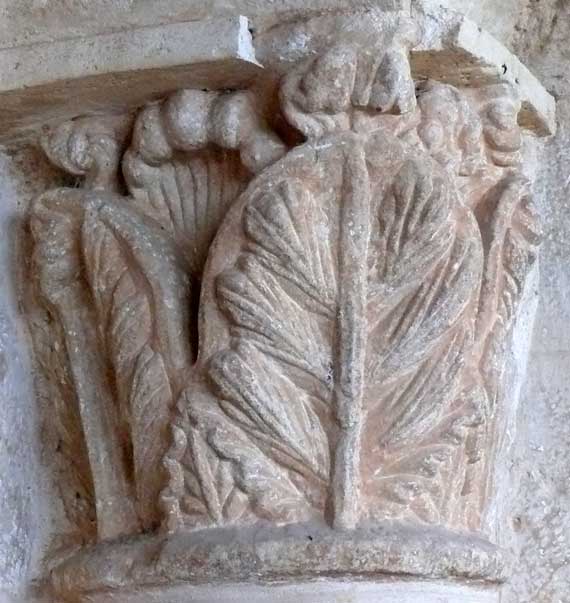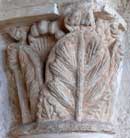 Esta capitel, el más próximo a la puerta del lado derecho, es el único no figurativo. Su motivo ornamental lo constituyen grandes hojas palmeadas de grueso nervio central y muy estriadas. |