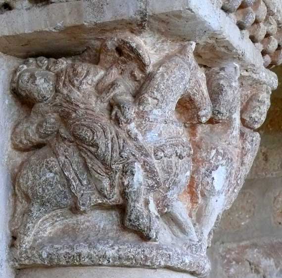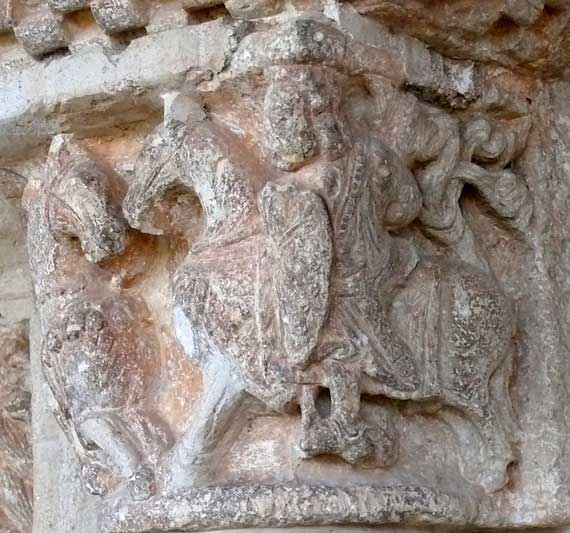En el capitel exterior del lado derecho puede presenciarse la lucha en torneo o en combate entre dos caballeros cristianos. Es un tema que, como el anterior de Sansón, se repite en la iconografía románica y que ya se vió en San Pedro de Caracena (capitel 2). Ambos caballeros portan escudo oval y blanden espadas, luciendo los caballos ricas gualdrapas. Uno de los combatientes es captado cuando cae hacia atrás derribado por el contrincante. En el otro ángulo se completa la escena descrita. |
