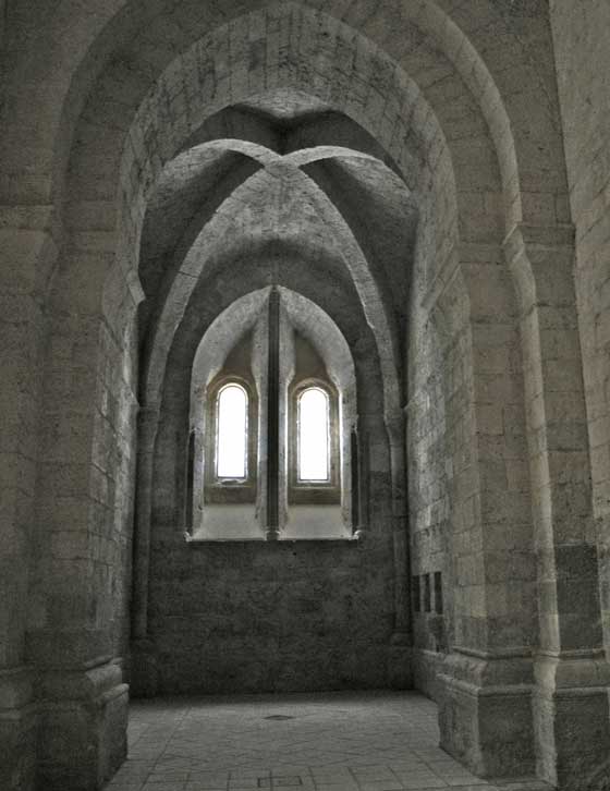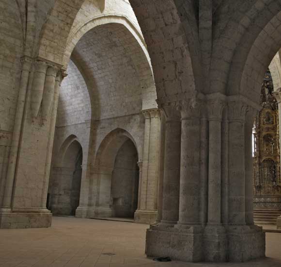Se aprecia en la imagen que el arco toral donde emboca la nave central no descarga sobre columnas adosadas completas, sino sobre esbozos superiores de columnas que no llegan al suelo y que funcionan como modillones de carga. Con esta estratagema, reiteradamente empleada en las iglesias cistercienses con algunas variantes, se trataba de conseguir la mayor amplitud posible para el despliegue del coro de los monjes que se situaba en esta zona. |
