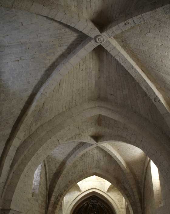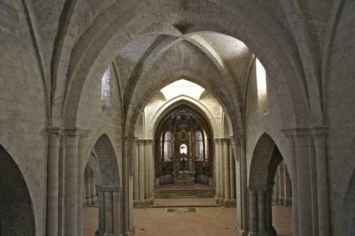 El plan constructivo de las iglesias románicas imponía que éstas se comenzasen por la cabecera y fuesen creciendo hacia los pies. En las épocas de transición estilística, como aquí sucede, no resulta extraño que los ábsides obedezcan a directrices arquitectónicas románicas (bóvedas de cañón) y que los sucesivos tramos de las naves respondan a criterios más góticos. Así, los dos primeros tramos de las naves (en la imagen se presentan los de la central) se cubren con bóvedas de crucería cuyos nervios descargan sobre columnas acodilladas; los tramos tercero y cuarto, por su parte, fueron modificados en el siglo XVI con motivo de la construcción del coro alto y se acomodan a las formas entonces imperantes. En todo caso, los arcos fajones de las tres naves son apuntados y doblados, siendo los arcos formeros apuntados pero sin doblar. |