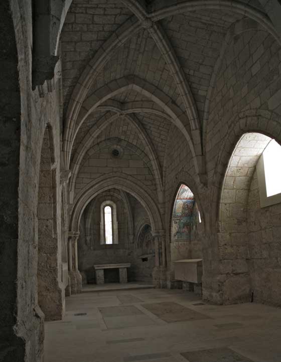 Las cuatro galerías (en la imagen, la oriental) se cubren con bóvedas de crucería. Los arcos perpiaños descargan sobre columnas adosadas a las pilastras, por un extremo, y sobre modillones de rollos típicamente cistercienses, por el otro. En esos mismos elementos de soporte apoyan las ojivas y los nervios formeros. Los triples arcos de cada tramo son de medio punto y voltean sobre capiteles de talla vegetal y columnas de doble fuste; todo ello sobre banco corrido. A las pilastras se adosan las columnas pareadas de los arcos extremos y otras dos en el frente; este haz de columnas es triple en los machones de esquina. |