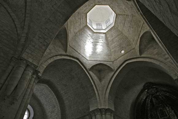 Sobre los cuatro arcos torales del crucero apoya la estructura del cimborrio. El paso de la proyección cuadrada a la octogonal se realiza por medio de trompas formadas por fragmentos de bóvedas apuntadas. La bóveda está constituida por una pirámide truncada octogonal cuya generatriz no es recta sino de pendiente variable. Sobre el conjunto monta una linterna proviniente del siglo XVII que suministra iluminación cenital al crucero. |