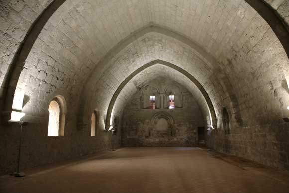 También se ha conservado el refectorio o comedor de los monjes. Para conseguir un espacio diáfano, evitando cualquier tipo de soportes interiores, esta sala de planta rectangular se cubre con bóveda de cañón apuntado reforzada por arcos perpiaños que dividen el espacio en cuatro tramos. Apoyan los arcos sobre ménsulas entregadas en los muros laterales. En el testero subsisten tres ventanas de factura románica: la inferior está cegada; las superiores no, pero posteriores edificaciones anexas privan de luz a estos vanos. |