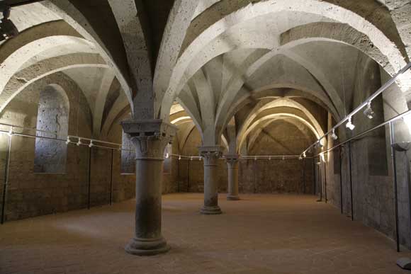 El scriptorium o sala de trabajos sí ha llegado hasta nosotros. Es una pieza rectangular dividida en dos crujías longitudinales por tres robustas columnas de capiteles al gusto cisterciense: someras hojas vegetales y ábacos y cimacios lisos. Soporta cada columna un haz de ocho arcos: de medio punto, los fajones, y apuntados, los formeros y las ojivas. El resultado es una bóveda de crucería en ocho tramos. Se ilumina por cuatro ventanales abiertos en el muro de naciente. |