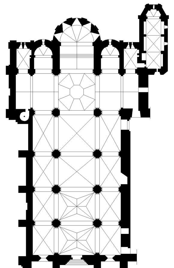Con la excepción que se acaba de apuntar, los soportes exentos responden al tipo compuesto con una sección de geometría equivalente a la aquí representada: un pilar cruciforme a cuyos cuatro lados se adosan sendos pares de semicolumnas. Se completa el haz con otras cuatro columnas acodilladas, una por cada ángulo de la cruz. Van todas coronadas por capiteles muy del gusto cisterciense, de sencillas representaciones vegetales y bolas pomáceas. Descansan sobre basas de bocel y pedestal prismático. |