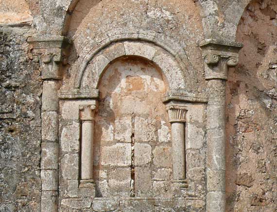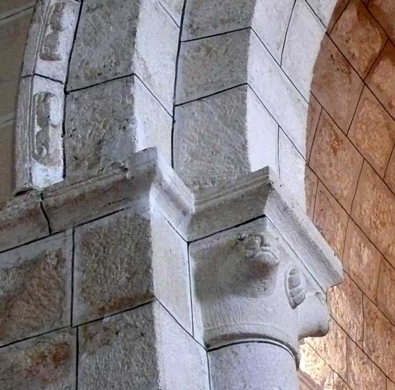 Toda la ornamentación del arco triunfal se reduce a una banda de bifolias dispuestas en el intradós de la chambrana y a los dos capiteles, iguales entre sí, tallados con dos cabezas animalescas de mucho relieve y una roseta en el centro de la cara interior. Los cimacios que se prolongan formando la imposta son de nacela y listel superior. |