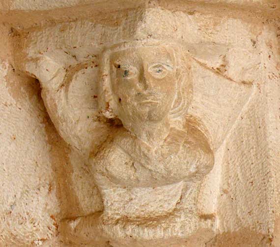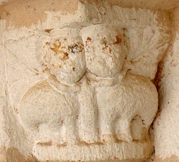 De los seis capiteles que aparecen en la portada, cuatro de ellos -los dos extremos de cada lado- son sensiblemente iguales entre sí en cuanto a su decoración: tres hojas incisas de escaso relieve que acaban en pomas o frutos bulbosos en su extremidad superior. De los interiores, el del lado derecho -el de la imagen- representa un animal de cabeza antropomorfa; el capitel izquierdo, dos cuadrúpedos enfrentados de cabezas casi irreconocibles y collarines en el cuello. |