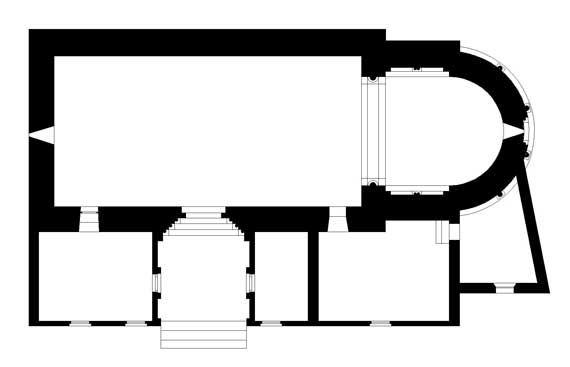 Es esta iglesia de nave única sin subdivisión en tramos. La cabecera está formada por una ábside semicircular y un presbiterio recto. La portada se abre en el muro meridional de la nave y va precedida de un pórtico de época moderna. Otras espacios han ido adosándose al costado sur de la nave, el presbiterio y el propio ábside, entre ellos el que se utiliza como sacristía. |