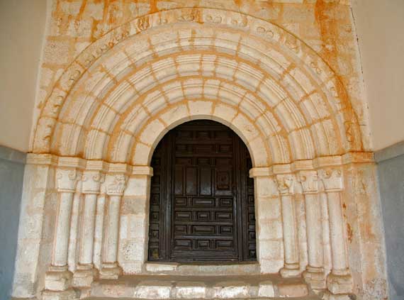 En el muro sur de la nave se dispone la portada, muy abocinada, protegida por un pórtico añadido a la nave en época reciente. Se compone de cinco arcos de medio punto: el interior posee arquivolta lisa y descansa sobre las propias jambas de la puerta; los tres siguientes están formados por columnas acodilladas con sus respectivos capiteles y lucen arquivoltas de baquetón; el exterior, que hace función de chambrana, presenta una arquivolta adornada con bifolias y carga sobre machones. |