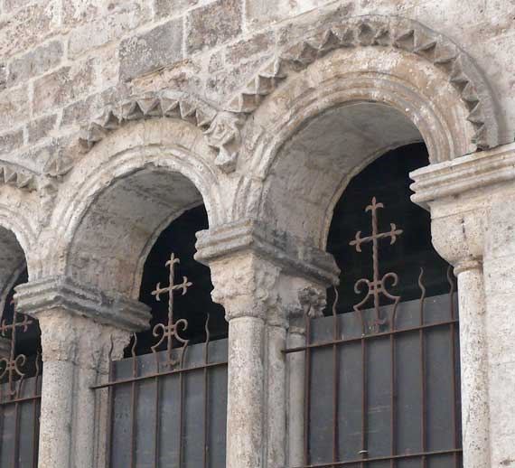 Los huecos están formados por arcos de medio punto que cargan sobre machones en cuyo frente se disponen columnas de fuste sencillo o doble pero en todo caso anilladas. La rosca interior de los arcos va decorada con ajedrezado, y la gruesa chambrana que los envuelve se adorna en su intradós mediante puntas de clavo. Los capiteles exhiben cestas vegetales con cimacios ajedrezados que dan continuidad a la imposta. |
