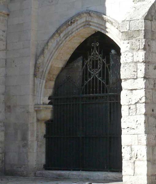 El acceso a la galería porticada por el lado oeste se efectúa a través de una portada que semeja a mayor escala a los vanos de la arcada. Es de medio punto con soportes de triple fuste a cada lado, capiteles corridos y cimacio de molduras lisas horizontales. Se trasdosa con una chambrana taqueada. Sobre la portada existe un diminuto rosetón de doce lóbulos bastante deteriorado. En el hastial oriental de la galería existe otra portada de arco apuntado con la misma decoración que toda la arquería: doble bocel en el frente del arco y chambrana de puntas de clavo. |