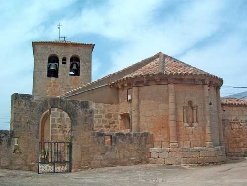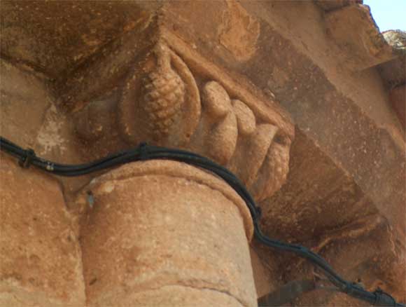 Uno de los capiteles cimeros de las columnas adosadas al paramento exterior del ábside lleva labradas hojas, piñas y bulbos que recuerdan mucho a los motivos ornamentales del Monasterio de Santa María de Huerta. Obviamente, el tendido aéreo que con sus cables trenzados emula un segundo astrágalo, las grapas, los angulares metálicos de fijación y demás chatarra aneja no pertenecen a la traza medieval de la fachada sino que constituyen una irreverente profanación artística de estas piedras románicas que no merecen el maltrato de cuantos desaprensivos las utilizan espuriamente. |