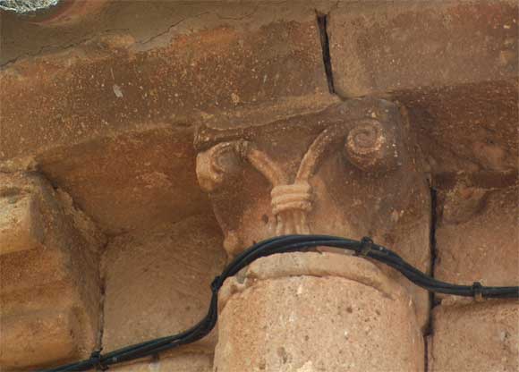 Los otros tres capiteles, muy similares entre sí, responden al tipo del de la imagen de haces de vástagos cuyos extremos se enrollan formando volutas. Los modillones que soportan el alero son de rollos como el que aparece a la izquierda de la imagen. Con respecto al infame cableado vale lo dicho anteriormente. |