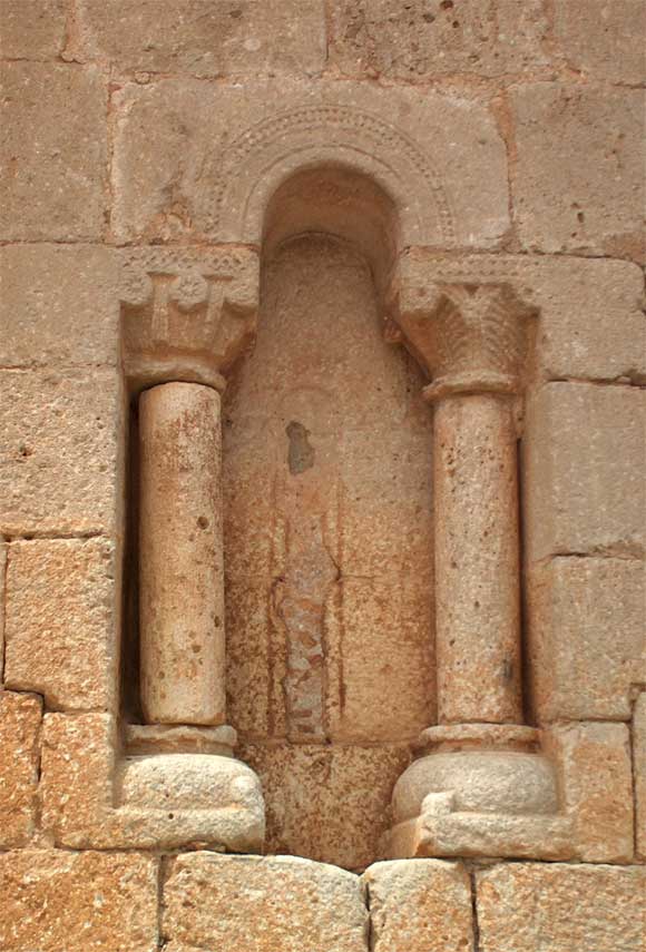 Cuenta el ábside con una única ventana de aspillera, hoy cegada, que se sitúa en posición axial. La forman dos columnas de fustes poco esbeltos, altas basas de garras, sencillos capiteles y arco de una sola pieza. Se adorna éste, al igual que los ábacos de los capiteles, con cenefa de rombos, incisos unos y en relieve otros. Los capiteles exhiben motivos vegetales como rosetas, palmas y roleos. |