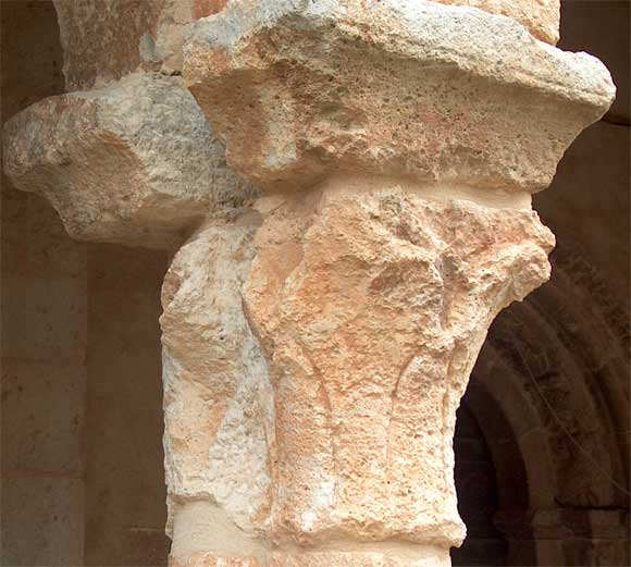 Tercer capitel exento. Muestra una labra de muy poco relieve y casi lisa que apenas insinúa unas vagas formas vegetales. |