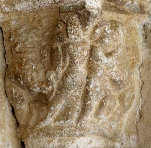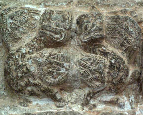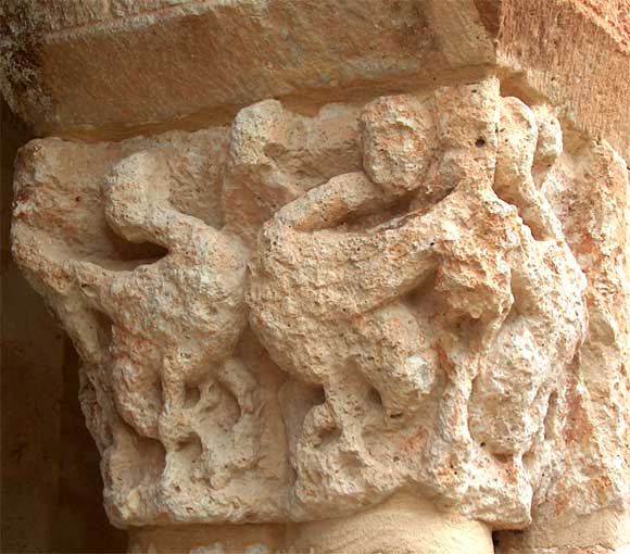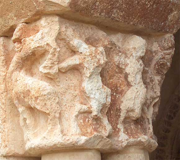 El capitel encumbrado sobre la columna izquierda representa dos sirenas de aire silense, una en cada cara. El de la derecha, unos individuos que pelean con animales cuadrúpedos erguidos sobre sus patas traseras. |