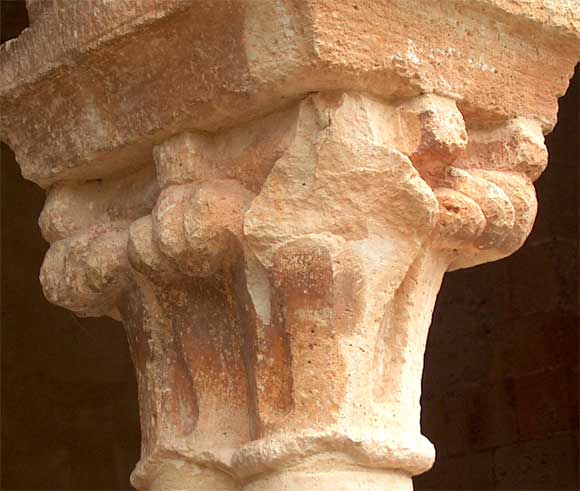 Primer capitel exento. También este capitel ha sido despiadadamente destruido. El ábaco, sobre todo, y el propio capitel aparecen partidos en dos como consecuencia de las obras de cerramiento que sufrió la galería. Se adivinan motivos vegetales en su composición. |