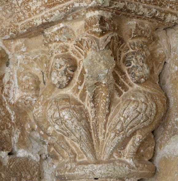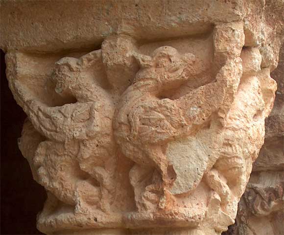 Capitel adosado al machón izquierdo. Este capitel figurativo representa unas fabulosas aves de trastornados cuellos que concluyen en cabezas humanas, y que vuelven hacia adelante por entre las patas sus cónicas colas. |
