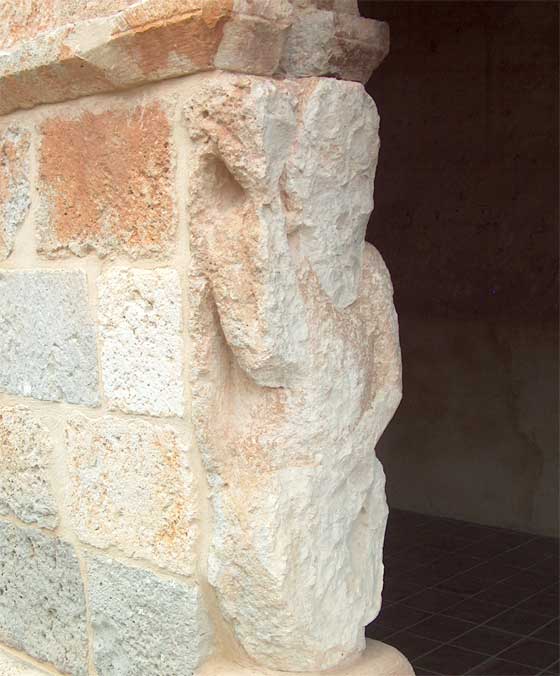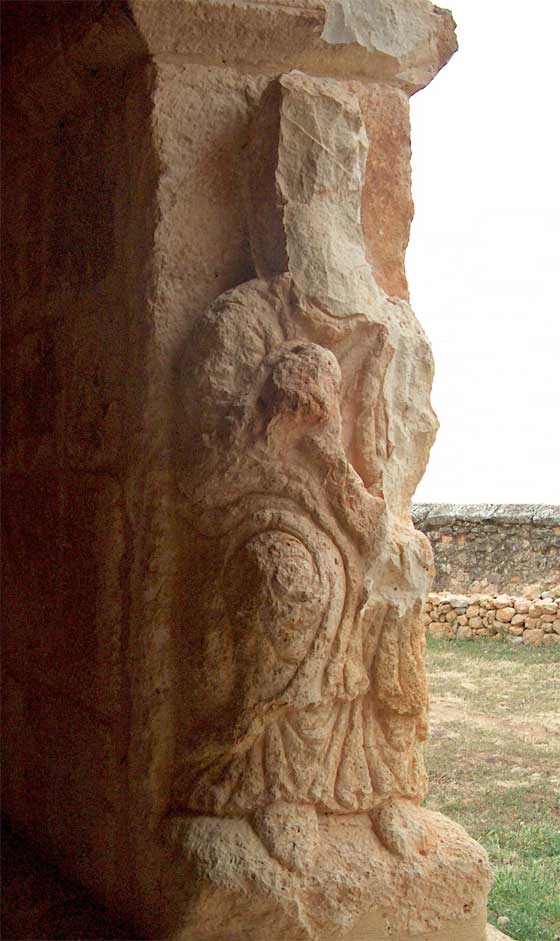 Cariátide del extremo occidental. Resulta de todo punto irreconocible. Fue destrozada sin miramiento a martillo y cincel cuando se cegó la galería, y aún se puede observar la escotadura superior en la que encajaba el cerramiento. |