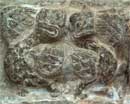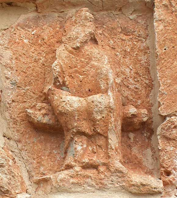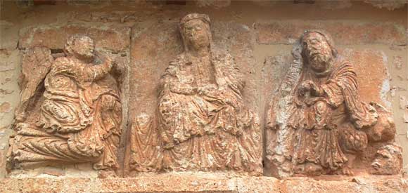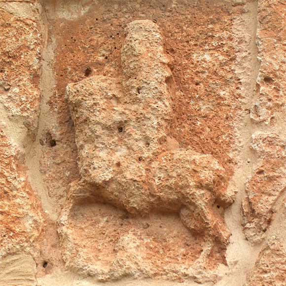 En ambas enjutas del arco central de acceso al pórtico existen sendos bajorrelieves sobre piedras rehundidas, de los que, el de la izquierda, representa a un caballero o simple jinete, y el de la derecha, un personaje sentado de difícil identificación. Las dos tallas se encuentran muy deterioradas. |