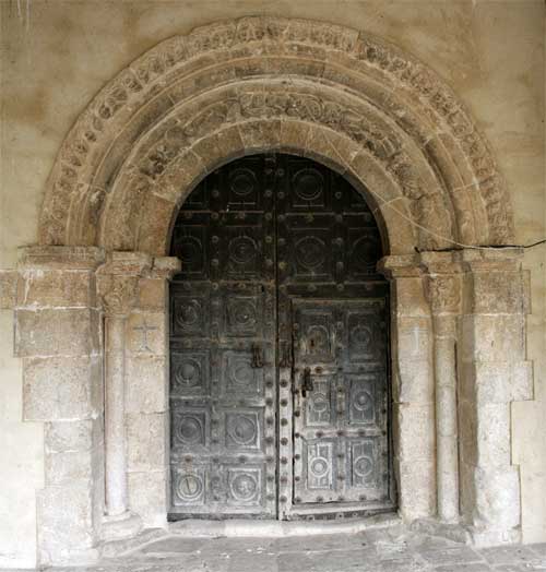 La forma un arco de medio punto de triple arquivolta, la central sobre columnas. La arquivolta interior, que descansa sobre las jambas de la puerta, es lisa; la exterior es de baquetón, con trasdós de roleos foliáceos. La central es la presenta mayor interés por méritos de su decoración.
