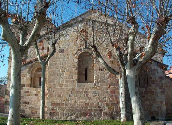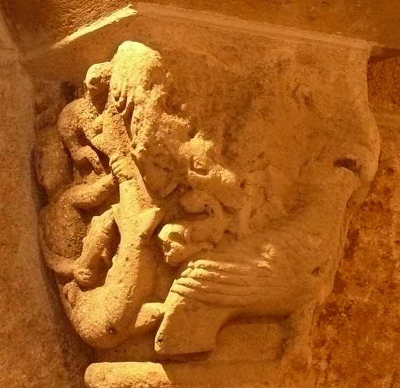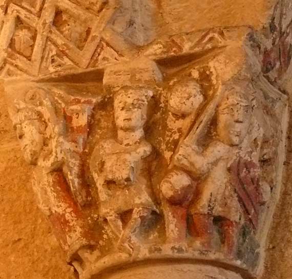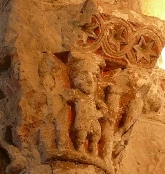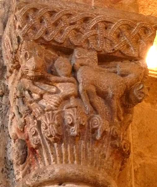 Tanto los muros laterales como el del testero del ábside central están recorridos por una arquería ciega que es de triple vano en los lados y doble en el frontal. Este recurso ornamental se encuentra también en la misma capital en la cabecera de la iglesia de Santo Tomé. Los soportes de estos arcos son de dispar tipología: de fustes de sección poligonal, en unos caso, o de pilastras, en otros. Entre los capiteles, en general deficientemente conservados, merece destacarse el central del lado izquierdo que muestra una sirena-pez en la tan repetida actitud interpretada como lujuriosa de alzar la cola (en este caso una sola) sujetándola con una mano mientras que con la otra exhibe un pez asido también por la cola. En la cara frontal del capitel aparece un ave, quizás una arpía, sobre la que se ha encaramado un pequeño cuadrúpedo rampante. Otro animalillo cuadrúpedo aparece asimismo por encima del extremo de la cola de la sirena. |