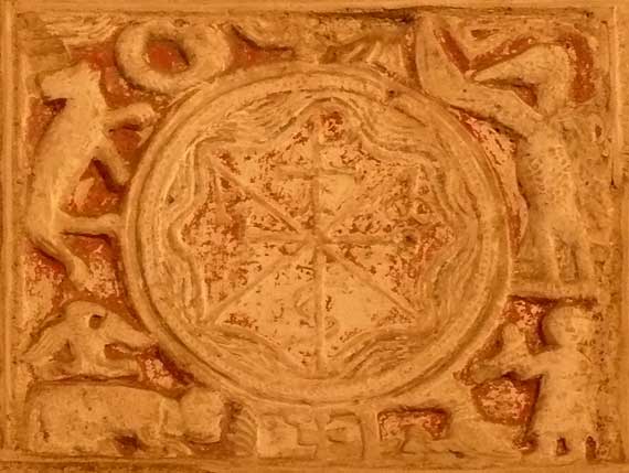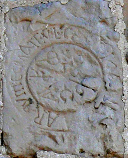En el muro lateral derecho del ábside mayor sobre la clave del arco ciego central se encuentra encastrado este crismón orlado y circular que no sólo muestra el Tetramorfos en sus enjutas sino también dos aves, una serpiente y, en la base, una cruz. Existen otros dos crismones en este templo: uno formando el antipendio de esa misma capilla y el otro al exterior en el muro meridional de la nave. Este último se encuentra girado de forma que la cara lateral izquierda del mismo hace ahora de base del sillar. En la leyenda que lo circunda se lee MARQVM ET MATEV[m] LVCAS ET IOANNES. |