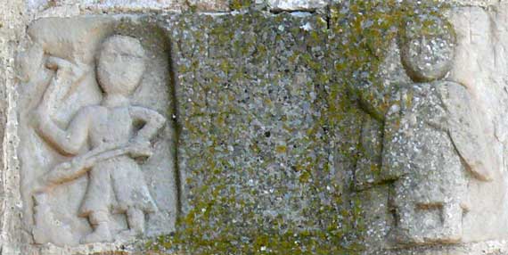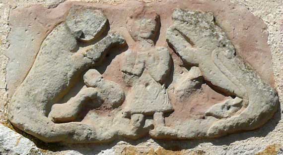 En las enjutas de la portada, sin que tengan relación con ella, se encuentran incrustadas algunas piedras talladas en relieve provenientes de lugares y orígenes desconocidos. Tal es el caso de esta representación del profeta Daniel en el foso de los leones, figurados éstos por los dos cuadrúpedos rampantes laterales, o las dos figuras humanas de la enjuta izquierda que representan respectivamente a un herrero con el martillo en alto ante el yunque y a San Pedro portando las llaves e identificado por el rótulo PETRUS APOSITOLUS. |