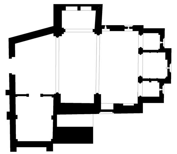Como ya se ha dicho al comentar su planta, esta iglesia debió estar distribuida originariamente en tres naves como lo denotan los tres ábsides subsistentes. Hubo de ser en época gótica cuando desaparecieron las compartimentaciones y se creó el espacio único actual. La cubrición de aquellas naves, presumiblemente realizada mediante bóvedas de cañón, dio paso a la que ahora se compone de dos grandes arcos diafragma que soportan un entrevigado de madera para formar una cubierta a dos aguas.