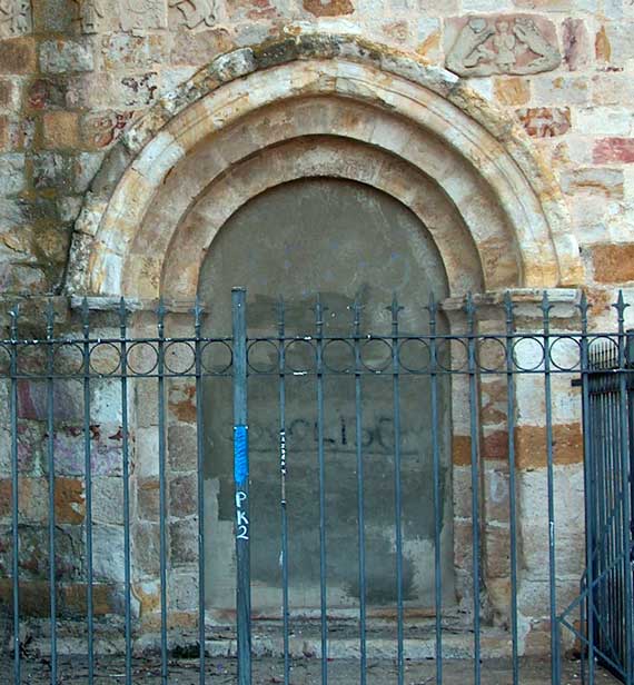 En el muro sur de la nave, en el primer tramo de la misma, se reubicó la portada cuya disposición primitiva se desconoce. Esta portada permanece cegada toda vez que la que permite el acceso al templo se encuentra en el imafronte, tratándose de un hueco adintelado cuya apertura data del siglo XVIII. La portada románica en desuso corresponde a la segunda fase de construcción de la iglesia. Está formada por arco de triple arquivolta y chambrana cargando sobre las jambas escalonadas. Todo es muy sencillo y carente de ornamentación. De que esta portada ha sido remontada no queda duda, pues la inscripción existente en su arco interior alusiva a la muerte de Alfonso VII no guarda el debido orden literal al haberse trastocado la posición de las dovelas. |