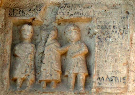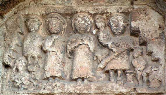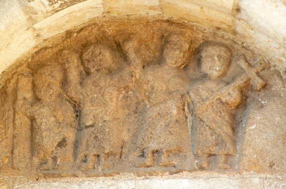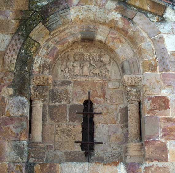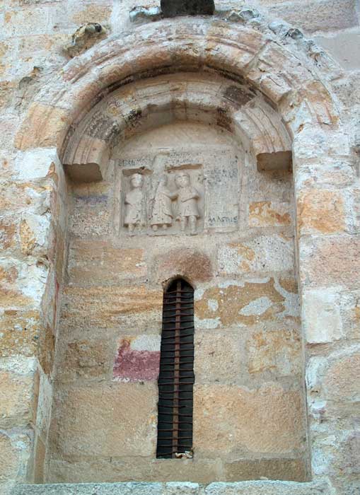 Esta ventana del ábside meridional está rehecha en buena parte. Está formada por un vano estrecho y alargado bajo un arco de medio punto de doble arquivolta y chambrana. La rosca interior descansa sobre columnas de cuyos capiteles no se conservan las cestas originales pero sí los altos cimacios con ornamentación de cestería, estando formadas las basas por una triple moldura tórica. En el frontón se incrustó un relieve que muestra cuatro figuras bastante deterioradas que pueden verse mejor en este detalle. Una de ellas lleva una cruz, mientras otra levanta los dos brazos. |