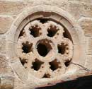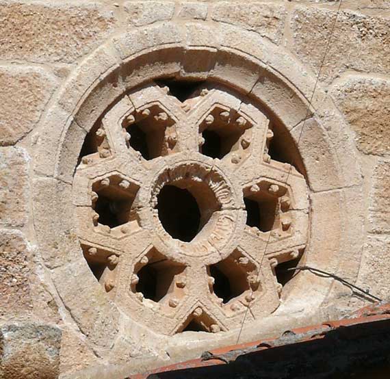 El testero del ábside se encuentra calado por un rosetón muy similar, por no decir idéntico, en su diseño y ornamentación al que luce sobre la portada norte de San Juan de Puerta Nueva o sobre la principal de Santiago del Burgo. Del círculo central, cuyo bisel se adorna con pequeñas hojitas, irradian seis brazos en forma de hexágono que exhiben como adorno bolitas que semejan capullos rosáceos. |