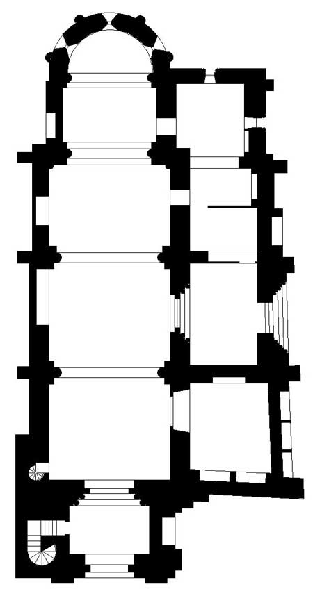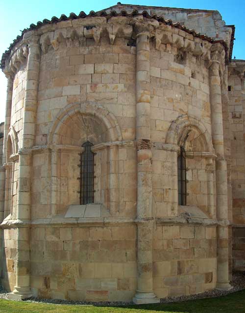 De trazado en hemiciclo, se encuentra dividido verticalmente en su paramento exterior por cuatro columnas de media caña que definen cinco calles de desigual anchura. Las extremas, de menor desarrollo perimetral, son ciegas, mientras que en las otras tres, más anchas, se abren sendas ventanas de aspillera. Bajo dichas ventanas circunda el ábside una imposta que abarca los fustes de las semicolumnas y se compone de doble caveto y bocel intermedio. A nivel del apoyo de los arcos de las ventanas, otra imposta corre por los machones que éstas delimitan y por los derrames de las mismas, interrumpiéndose en los vanos; es de lista superior, bocel intermedio y caveto inferior. Un rasgo insólito de los fustes de las semicolumnas es que no presentan continuidad vertical en todo su desarrollo; el muro que envuelve el cuerpo superior del ábside es de menor espesor que el de los inferiores, produciéndose un escalón por retranqueo que lo acusan también las medias columnas. |