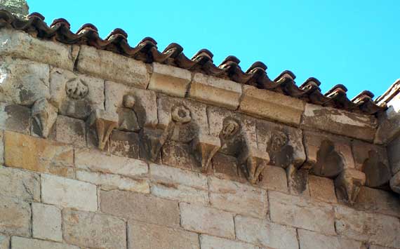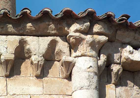 La cornisa del ábside está formada por arquillos trilobulados que apoyan sobre modillones en forma de pirámides invertidas, en lo que guarda similitud con la de la Colegiata de Santa María la Mayor de Toro. Las columnas adosadas cortan la cornisa y llegan hasta el alero al que dan soporte con sus pequeños capiteles. Son estos de hojas vegetales y frutos pomáceos. |