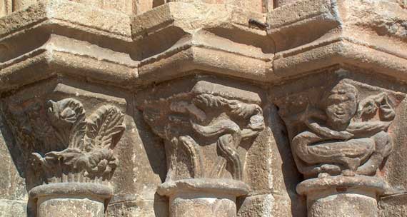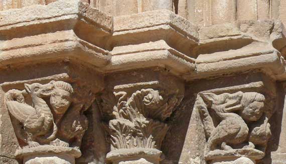 De los capiteles del lado izquierdo, los dos de los extremos repiten el mismo tema: un rostro humano central es mordido por dos animales dragontinos con cuerpo de ave y grandes fauces que se disponen simétricamente en una y otra cara del capitel; el del centro muestra un doble orden de hojas de acanto. |