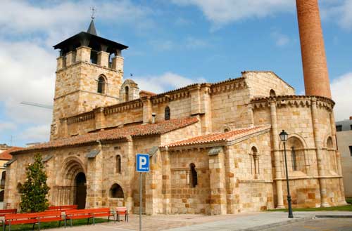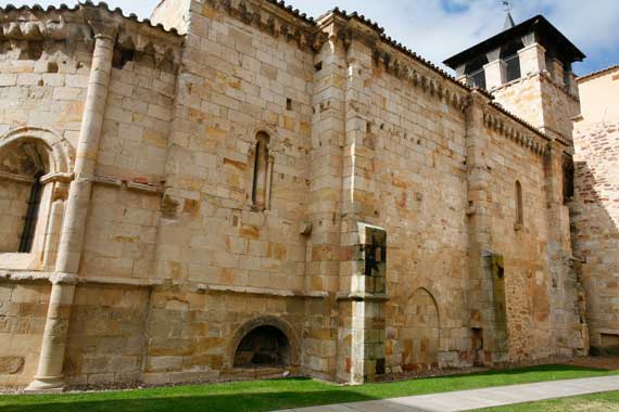 El actual edificio es el resultado de varias etapas constructivas. En origen se levantó la nave principal de tres tramos y la cabecera constituida por presbiterio y ábside semicircular. Poseía triple acceso: por el norte para comunicación con el monasterio (hoy cegado), por el oeste mediante portada centrada en el eje longitudinal de la iglesia, y por el sur a través del hueco abierto en el paño del tramo intermedio. Finalizada esta obra y sin solución de continuidad, ya en el siglo XIII, se acopló la torre al paramento occidental. Para mantener el acceso por ese extremo la planta baja de la torre es diáfana y comunica con el exterior por una portada enfrentada a la primitiva, formando un pórtico que prolonga la nave. En el lateral norte de la torre un cuerpo de una sola planta acoge la escalera de subida a ésta. Todavía después, pero siempre en época y estilo románicos, se añadieron a la fachada meridional varios espacios dispuestos con apariencia externa de una segunda nave, si bien la compartimentación interior no le confiere ese carácter. Al igual que había sucedido con la portada occidental cuando se adosó la torre, también aquí hubo de repetirse al exterior la portada que ahora quedaba sin su auténtica función, originándose entre ambas un pórtico cerrado. |