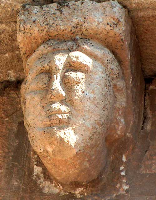 En el paramento meridional de la sacristía se abre esta ventana de hechura románica compuesta por un arco de medio punto de cuatro dovelas lisas sin decoración, una imposta que recorre todo el lienzo entre contrafuertes y que engloba los cimacios de los capiteles, y dos robustas columnas de capiteles vegetales alzadas sobre podios. El hueco está perforado en su totalidad a excepción de un pequeño tímpano. Aunque no forma parte de la fachada meridional es de indicar que en el testero de este cuerpo existe otra ventana de similar factura, de columnas algo más esbeltas, vano de aspillera y capiteles también vegetales pero cuyos cimacios no se prolongan en imposta alguna. El alerolo forma una moldura similar a la de la imposta asentada sobre modillones piramidales invertidos como los del ábside, con la singularidad de que uno de ellos -el que se muestra aquí- representa una cabeza humana. |