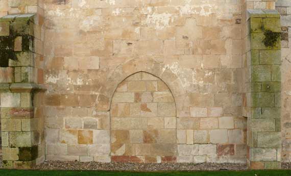 Ya se ha dicho al describir la planta que el frente meridional presenta una fachada superpuesta a la primitiva, la que correspondería al muro de esta misma orientación de la nave única original.