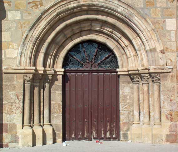 La portada que se abre en el muro oeste de la torre es de una enorme simplicidad: un doble arco de medio punto, de dovelas lisas sin ningún tipo de decoración, apoyando en las jambas también lisas y desnudas de cualquier ornamento. No existen columnas ni capiteles; sólo una breve imposta de estilo zamorano formada por un listel y una escocia, y una chambrana de igual diseño. |