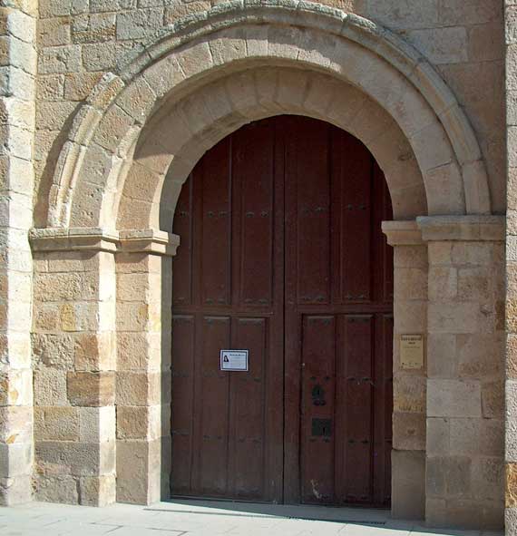 La portada meridional exterior -que como se ha indicado no da acceso directo a la nave sino a un espacio de transición o pórtico en el que coexiste enfrentada la otra portada más antigua- está formada por una arco de medio punto de cuádruple arquivolta sin más ornato que una sucesión de baquetones y escocias, más una nacela exterior que hace de chambrana. La arquivolta interior descansa sobre las jambas y las otras tres sobre columnas acodilladas, con interposición en todo caso de una gruesa imposta que engloba los cimacios de los capiteles. Las columnas se alzan sobre altos podios prismáticos lisos. |