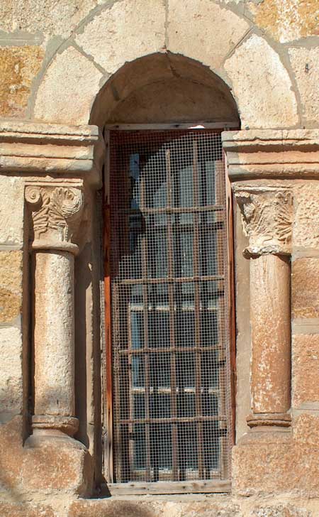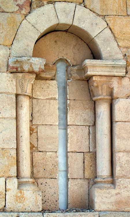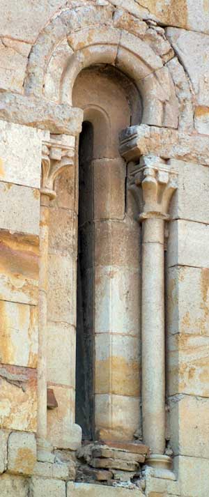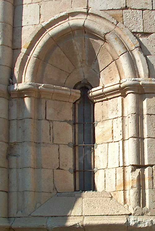Las ventanas absidales son de alta y estrecha abertura, en aspillera, con marcado derrame no sólo lateral y de base sino también en el arco. Está formado éste por un grueso bocel que por debajo de la imposta se prolonga verticalmente por la arista de las jambas a modo de dos fustes de columnas carentes de capiteles suplidos por la propia imposta. El arco esboza un ligero apuntamiento. |