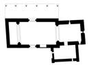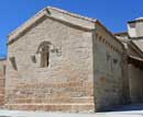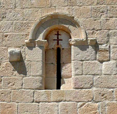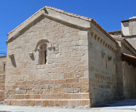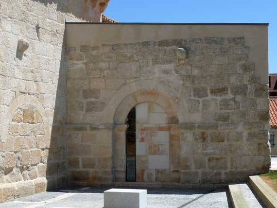 La cabecera es recta como sucede frecuentemente en las iglesias zamoranas. Presenta un recrecido en altura realizado modernamente sin que se haya perdido el alero primitivo soportado por canecillos de forma troncopiramidal. Tres son las ventanas que se abren en sus muros: un simple hueco verticalmente alargado en cada uno de los laterales y otra en el testero (verla aquí). Es ésta la que presenta mayor atractivo. Es de aspillera bajo arco de medio punto liso y chambrana de listel y escocia. La imposta, muy deteriorada, es similar a la de la portada. Sobre el hueco, en un gran sillar a modo de tímpano, está grabada una cruz patriarcal de doble brazo, el superior algo más corto. |