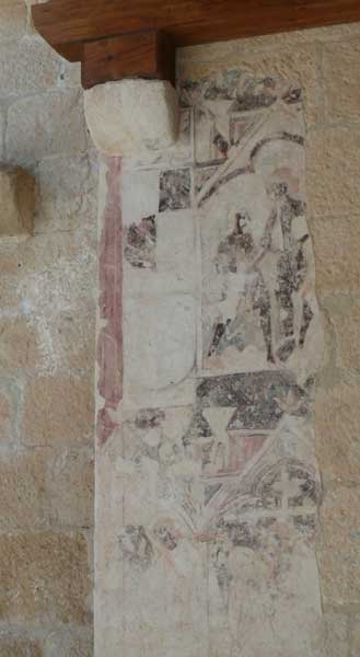 Sobre el muro norte de la nave, en el extremo oriental del mismo bajo el pórtico quedan restos de unas pinturas que debieron cubrir en otro tiempo ese lienzo en el que se sitúa a la portada principal. Habían permanecido ocultas e ignoradas y salieron a la luz cuando se procedió al derribo en 1999 de unas edificaciones adosadas. |