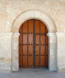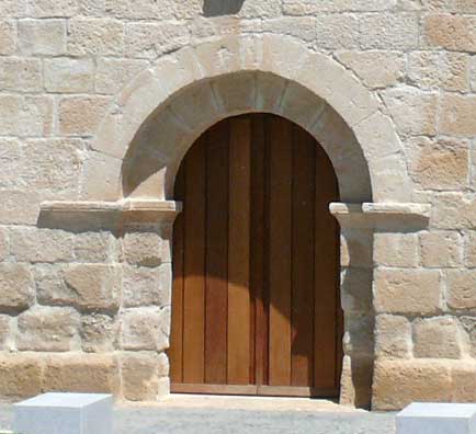 En la fachada meridional se abre una portada (ver detalle) muy similar a la de la fachada opuesta. Consta como aquélla de un arco de medio punto doblado que descansa sobre las jambas con la sola mediación de una imposta de listel y escocia. Pueden observarse los canzorros que también se alinean en esta fachada, al igual que en la opuesta y en toda la cabecera y que servían de soporte al durmiente sobre el que apoyaba el pórtico. |